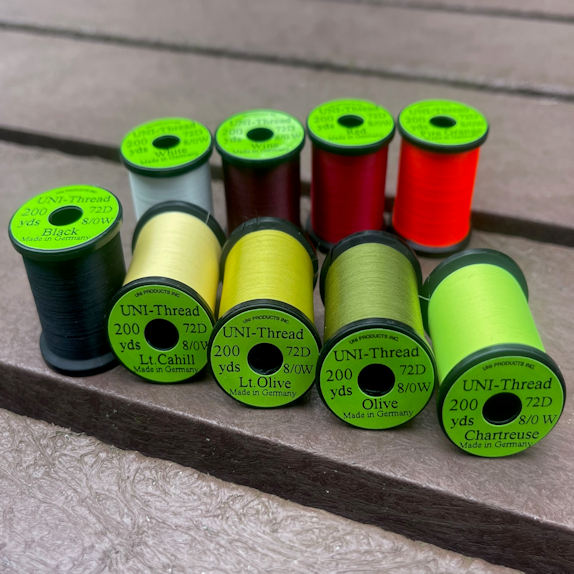 UNI-Thread is very much an ‘industry standard’ and a thread many of us grew up tying with, and it’s still as popular today as ever for those that like a waxed thread. The colour range is perfect, and the UNI-Range does boast some of the favourite thread colours in fly-tying, we particularly like their Fire Orange, Light Cahill, and Chartreuse. This is one of the strongest 8/0’s on the market, and is ideal for trout patterns from sizes 10-18. These are the larger 200yd spools – so enough to tie plenty of flies!